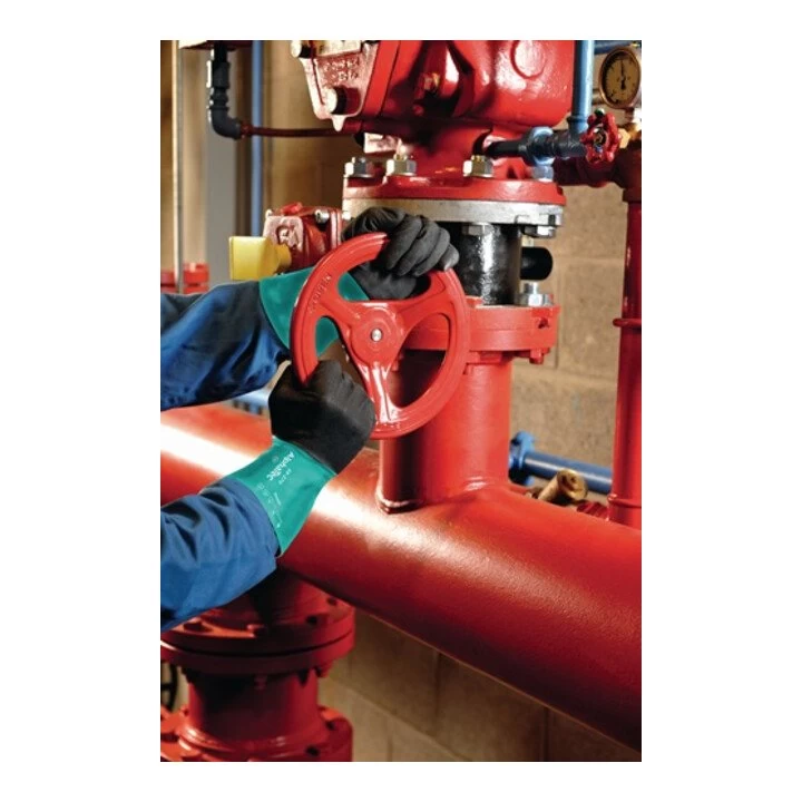 nach EN 388 · EN 374 · Kat. III · Material: Nylon mit Nitrilbeschichtung · Ansell Grip Technology® · für Chemikalienarbeiten mit leichter bis mittelschwerer Belastung · optimale Griffsicherheit · Tragekomfort · Fingerbeweglichkeit · exzellente Tastsensibilität und Flexibilität · minimaler Wärmestau, dadurch schwächere Schweißbildung · flüssigkeitsdicht · für Lebensmittel geeignet · antistatisch gem. EN 1149 · Anwendung: Wartungsarbeiten, Leichtmontage in Chemikalienumfeldern, Chemikalienverarbeitung, Arbeiten mit verölten und fettigen Gegenständen und Materialien, Raffination, Handhabung von Lacken, Druckfarben, Färbemitteln, Leimen und Klebstoffen Weitere technische Eigenschaften: · Abriebfestigkeit: 3 · Weiterreißfestigkeit: 3 · Stichfestigkeit: 1 · Schnittfestigkeit (Schneidetest): 1 · Ausführung: antistatisch, Schutzstulpe · Norm: EN 388, EN 374, EN 1149 · Chemikalienfestigkeit: J = n-Heptan / K = Natriumhydroxid 40 % / L = Schwefelsäure 96 % / O = Ammoniakwasser 25 % / P = Wasserstoffperoxid 30 % / T = Formaldehyd 37 %