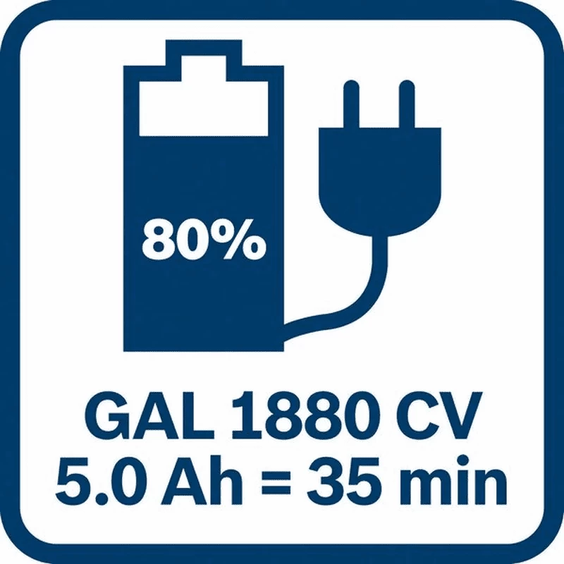 Ladegerät Starter-Set GAL 1880 CV und 2 x GBA 18 V 5,0 Ah M-C. 2 x 18-Volt-Akkus mit 5,0 Ah und Schnellladegerät. Das Multivolt-Schnellladegerät für alle Li-Ion-Akkus von 14,4 18 Volt. Schnelllademodus: Ein 5,0 Ah Akku ist bereits nach 35 Min mit 80 Prozent seiner Kapazität einsatzbereit. 50 Prozent schnelleres Aufladen der Akkus (vgl. mit AL 1860 CV). Active Air Cooling für längere Lebensdauer der Akkus. Komfortable Kabelaufwicklung. Sehr kompakt. Schnellladegerät GAL 1880 CV (1 600 A00 B8G), 2 x 5,0 Ah Li-Ion Akku (1 600 A00 2U5)