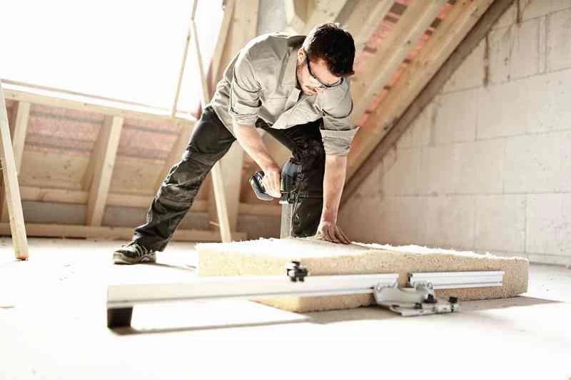 - Winkelgenauer und maßgenauer Zuschnitt von flexiblen Dämmstoffen – in Kombination mit der Führungsschiene und dem Winkelanschlag FS-WA-ISC