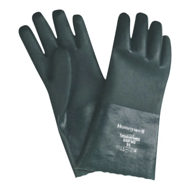nach EN 420, EN 388 · Kat. III · Material: PVC tauchbeschichteter Baumwollträger · angerauhte Oberfläche · raue – gepuderte Oberfläche verbessert die Griffsicherheit bei Objekten in fettiger oder feuchter Umgebung · Länge 40 cm · Stärke 1,6 mm · Anwendung: Handhabung mit Ölen und Fetten, Chemikalien, Kolenwasserstoffe, Landwirtschaft, Automobilindustrie und Bauteileproduktion, Chemische Industrie, Petrochemie Weitere technische Eigenschaften: · Abriebfestigkeit: 4 · Stichfestigkeit: 1 · Weiterreißfestigkeit: 2 · Schnittfestigkeit (Schneidetest): 1 · Ausführung: angeraute, gepuderte Oberfläche · Stärke ca.: 1,6mm · Norm: EN 388, EN 374 · Chemikalienfestigkeit: K = Natriumhydroxid 40 % / L = Schwefelsäure 96 % / N = Essigsäure 99 % / O = Ammoniakwasser 25 % / T = Formaldehyd 37 %