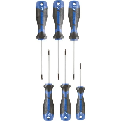 Ausgestattet sind die Schraubendreher mit einem ergonomischen 2-Komponentengriff, die Ihnen ein sicheres Arbeiten sowie eine angenehme Handhabung ermöglichen. Der 6-teilige Schraubendrehersatz enthält Schraubendreher mit Torx-Profil in den Größen TX8 x 60 mm, TX10 x 100 mm, TX15 x 100 mm, TX20 x 100 mm, TX25 x 100 mm und TX30 x 115 mm.