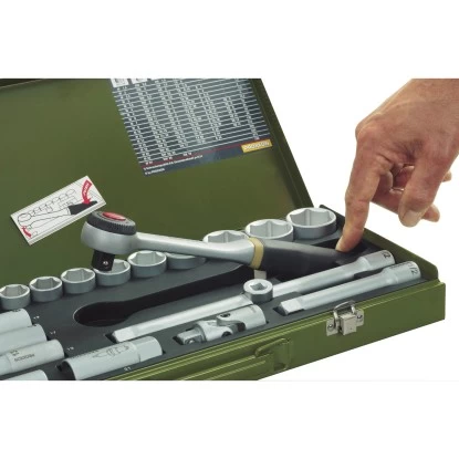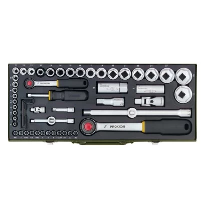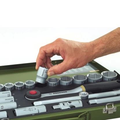 Der Proxxon Steckschlüsselsatz 1/4″ und 1/2″ wird in einem stabilen, pulverbeschichteten Stahlkasten geliefert und besteht aus hochwertigem Stahl.