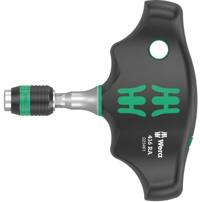 Der Wera Quergriff-Bits-Handhalter 416 RA besitzt eine Ratschenfunktion und ein Schnellwechselfutter. Die integrierte Ratsche mit Feinverzahnung (80 Zähne/Rückholwinkel 4,5°) vereinfacht und beschleunigt das Schrauben ohne mühsames Neuansetzen. Die vollständig in den Griff eingebettete Knarrenmechanik sorgt für sehr handliches und angenehmes Arbeiten. Die ergonomische Form des Griffs füllt den Handballen gut aus, die Finger liegen sicher in den weich gerundeten Griffmulden. Die ganze Hand findet Kontakt zum Griff, Reibungsverluste zwischen Hand und Griff werden vermieden. Dank eines Umschalthebels kann der Rechts/Links Richtungswechsel bequem in Einhand-Bedienung erfolgen.
